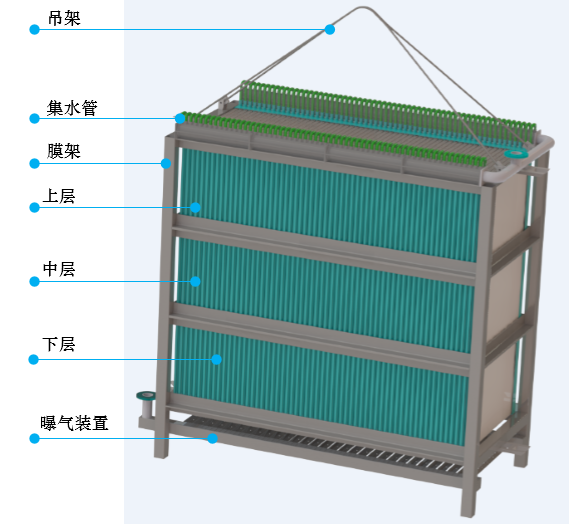 (9)膜組器的獨(dú)特結(jié)構(gòu)設(shè)計(jì),充分強(qiáng)化了水力學(xué)循環(huán),提高水力對(duì)膜表面的擦洗 效率,同時(shí)提高氧氣的利用率;
